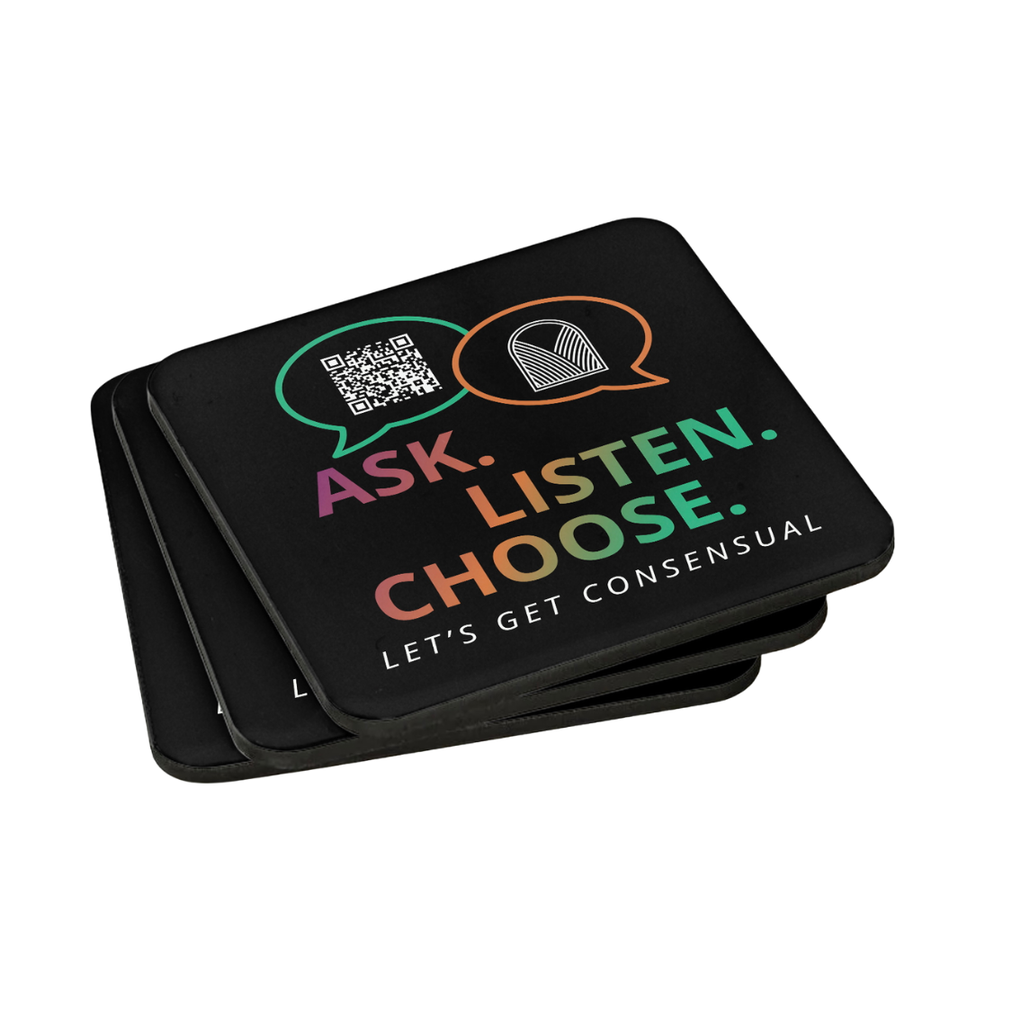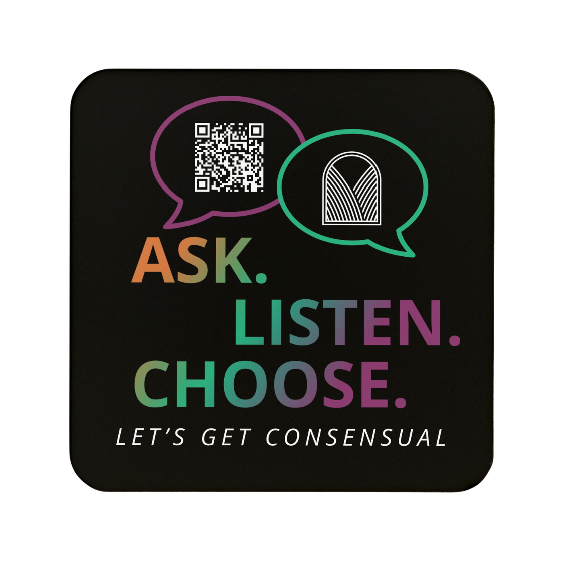 Featuring the “Let’s Get Consensual” logo and a QR code that links to resources and a donation page.