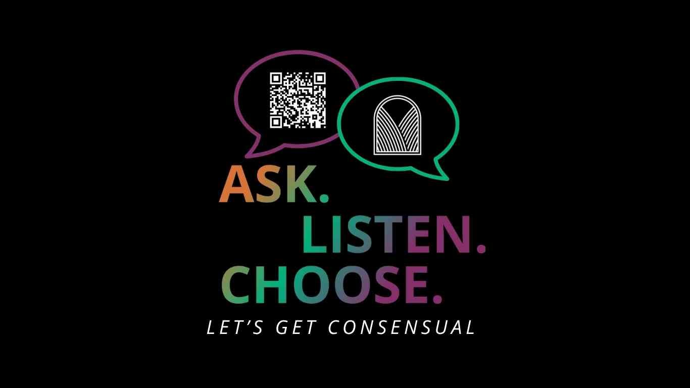 Featuring the “Let’s Get Consensual” logo and a QR code that links to resources and a donation page.